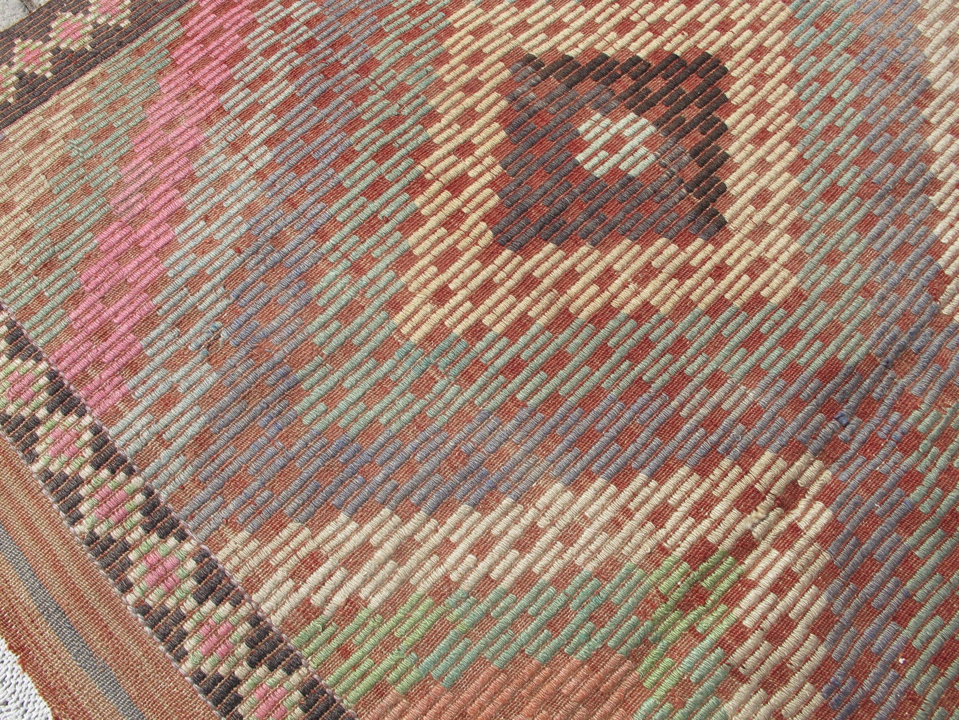 Discover the timeless elegance of this exceptional vintage Oushak kilim, handwoven in the renowned weaving region of Western Anatolia. This stunning piece showcases the distinctive pastel and faded tones characteristic of authentic Oushak textiles, featuring traditional geometric patterns that have graced Turkish homes for generations.