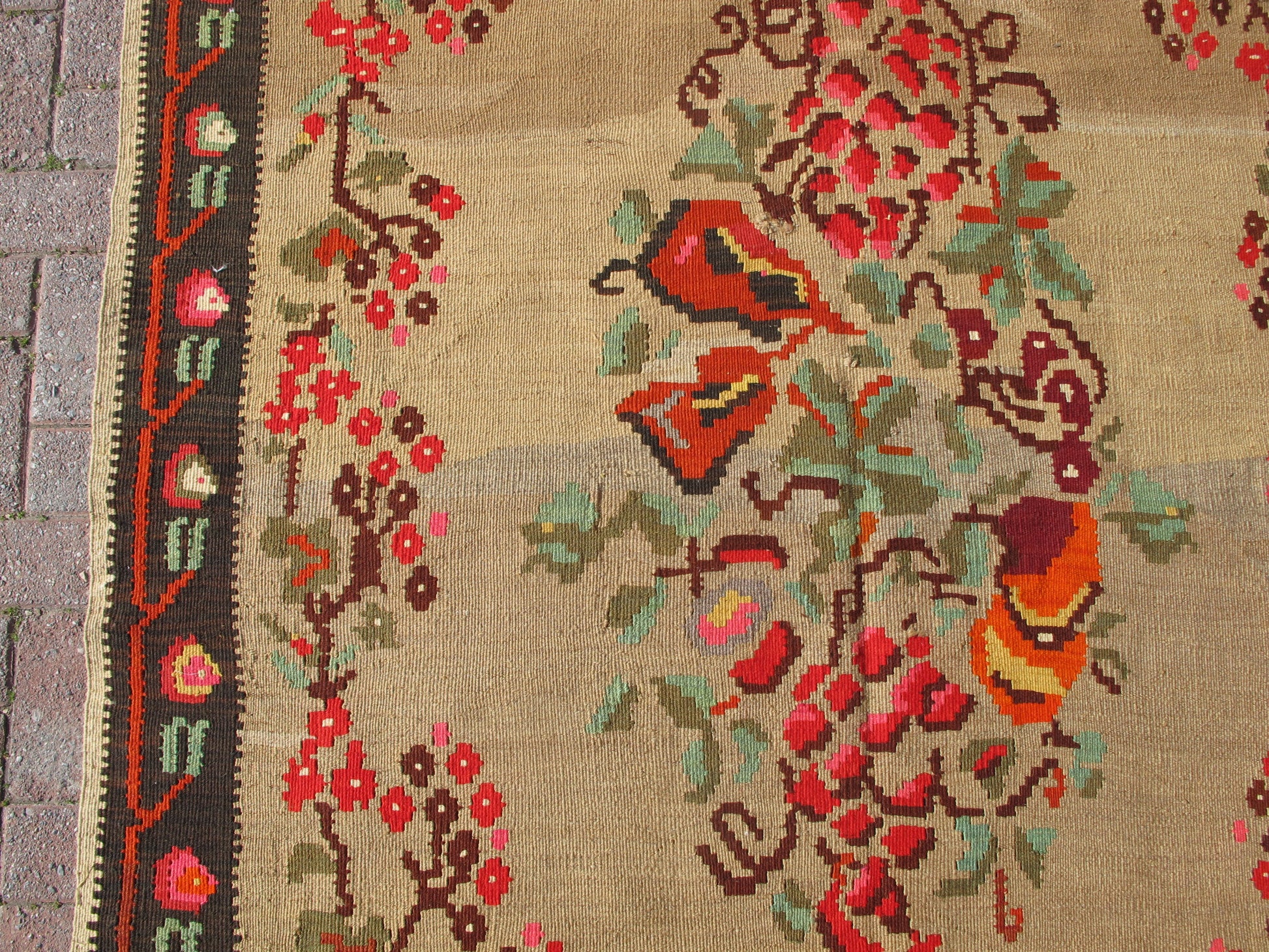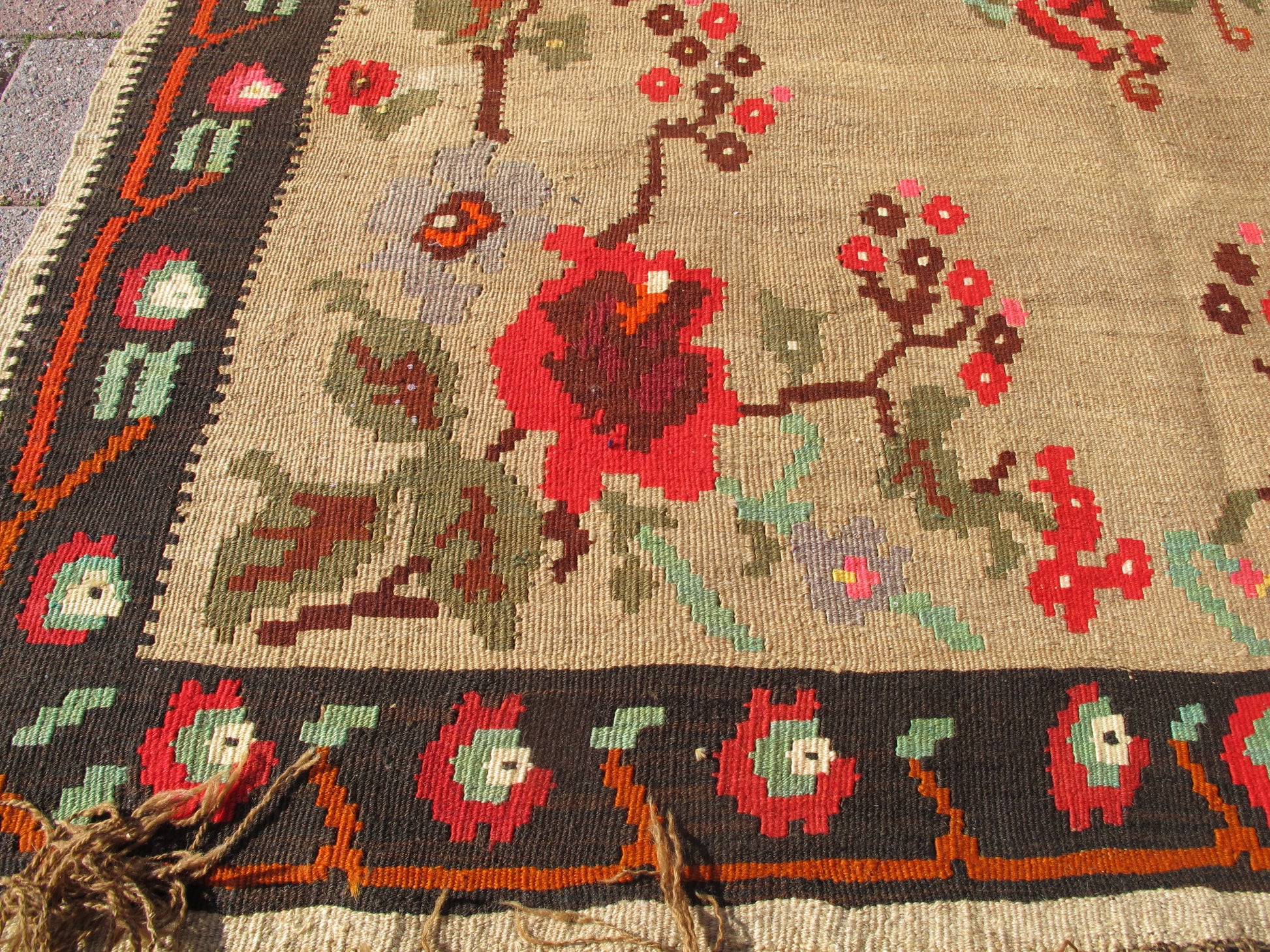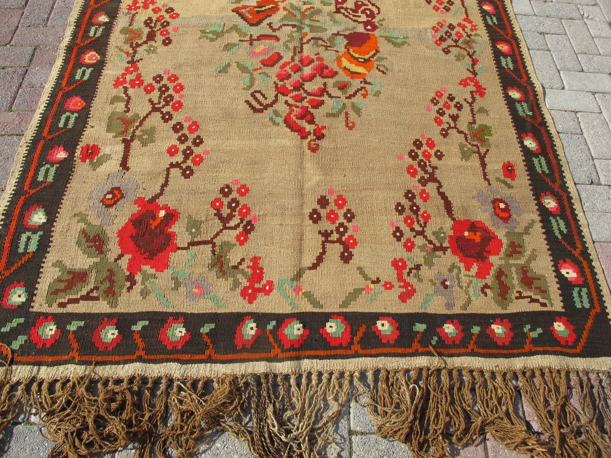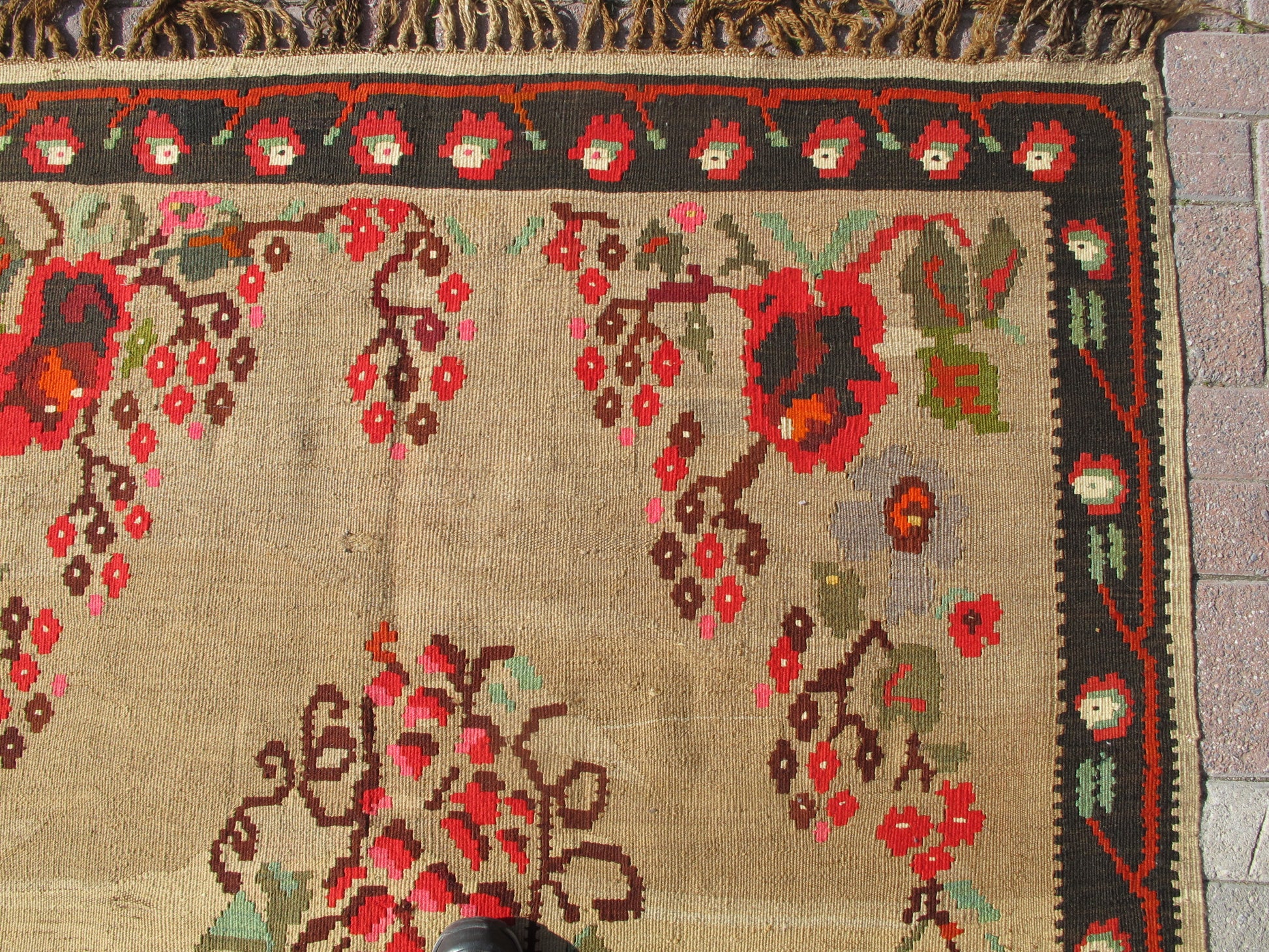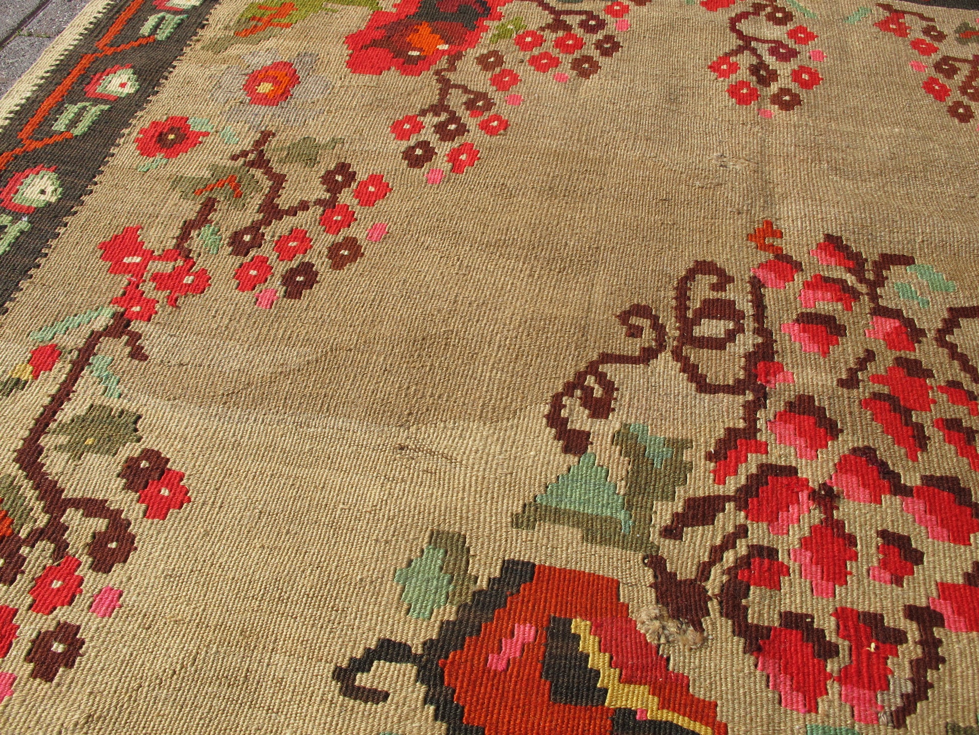 Discover the timeless beauty of this exquisite vintage wool kilim, handwoven by nomadic artisans in the historic region of Kars, Eastern Anatolia. This authentic piece showcases the rich heritage of Turkish tribal textile artistry, featuring the natural wool color indigenous to the region's sheep—a rare and distinctive characteristic that speaks to its authenticity.